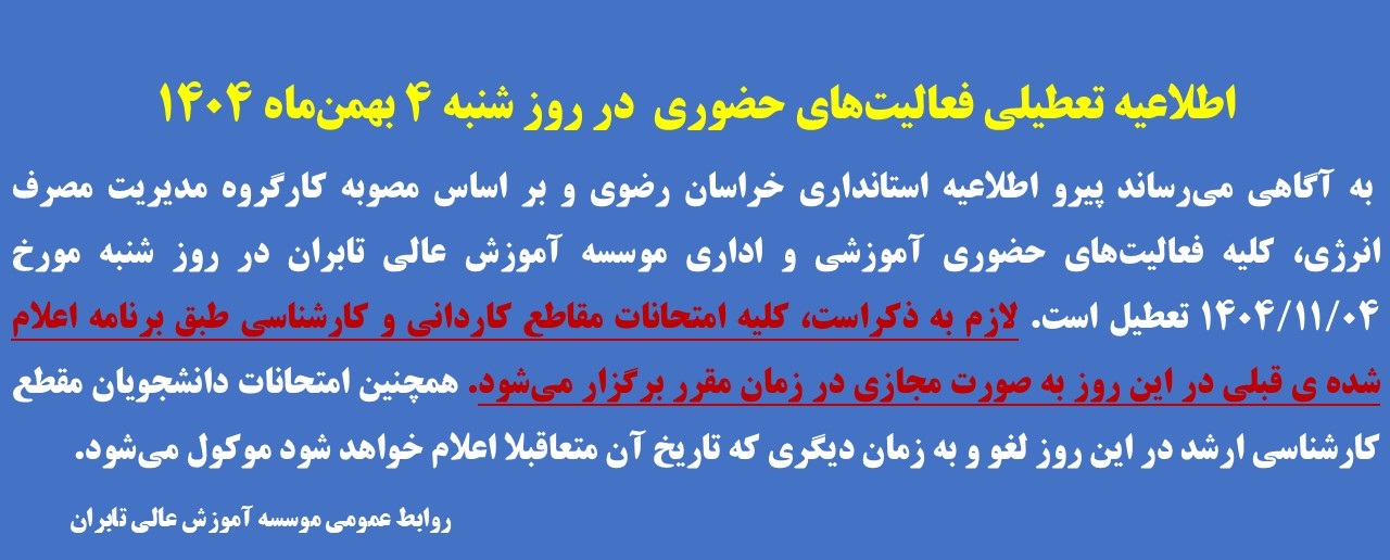 به آگاهی میرساند پیرو اطلاعیه استانداری خراسان رضوی و بر اساس مصوبه کارگروه مدیریت مصرف انرژی، کلیه فعالیتهای حضوری آموزشی و اداری موسسه آموزش عالی تابران در روز شنبه مورخ 1404/11/04 تعطیل است.